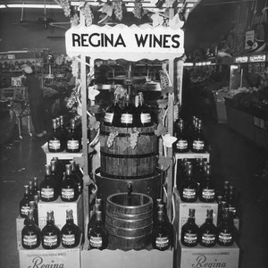 Photograph of Regina Wines display in a market. Display includes wine press and barrels surrounded by bottles of wine. If you know any details from this image please contact the Rancho Cucamonga Public Library at (909) 477-2720 or reference@cityofrc.us