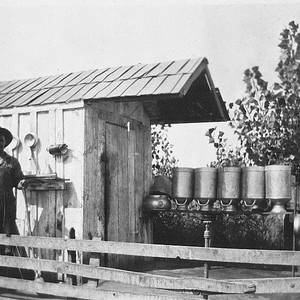 An early day dairyman stands next to a milking shed near the junction of State Highways 99 and 198 west of Visalia, CA, in the early 1900s. This dairy no longer exists. (Photo courtesy of Larry Merriott)