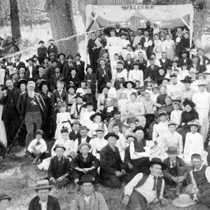 The Pattee family of Eshom Valley, CA, hosted a family picnic on July 4th in 1892. Those attending included: Jason Pattee (white beard, behind seated boy, left side of photo); Elizabeth Pattee (at Jason Pattee's left; sister of Chloe Tharp); Jesse Pattee (front center, white shirt, lying down leaning on elbow); Others in photo but not pointed out: Frances (Fanny) Hill, Jesse's future wife; Outlaw Chris Evans, who taught Jesse Pattee how to fell a redwood, thus starting Jesse in the logging business. (Photo courtesy of Dallas Pattee)