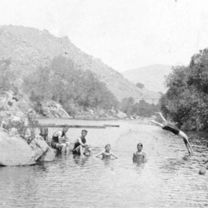 Four children near Three Rivers, CA, pose in the Kaweah River at Indian Point as one of their peers demonstrates his diving skills. (Photo courtesy of Pam Wallace)