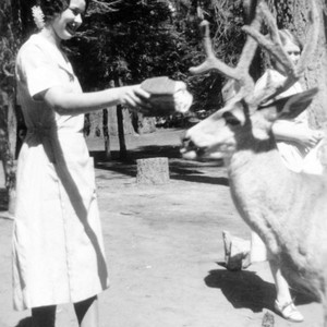 Rachel Jane Harper (Ricketts) is shown feeding a buck mule deer at Giant Forest in Sequoia National Park. The photo was taken in 1931 when she worked as a waitress in the dining room. (Photo courtesy of Jane Ricketts)