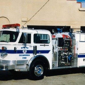 Color photograph of 1982 Century American LaFrance firetruck. If you know any details from this image please contact the Rancho Cucamonga Public Library at (909) 477-2720 or reference@cityofrc.us