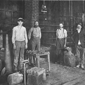 Henry Traeger had his blacksmith shop on the southeast corner of Main and Oak in Porterville, CA. This photo was taken about 1900 and included, left to right, Adam Motsinger, Frank Woodley, Henry Traegerr, and Matt Flynn. (Photo courtesy of Porterville Library)