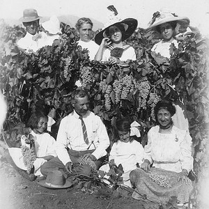The Melidonian family, shown here in the 1920s among their grape vineyards in Yettem, CA, proudly display their crop of grapes. (Photo courtesy of Lucinne Bennett)