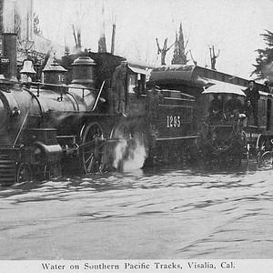 This Southern Pacific Railroad train doesn't let a little watter stop it as it visits Visalia, CA, during a flood season ca 1900.