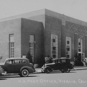 The United States Post Office in Visalia, CA, is located on the south side of Acequia St. between Court and Locust Sts. This photo, taken in the late 1930s, shows the building that remains in use as of 2009. (Photo courtesy of Carol Earl)