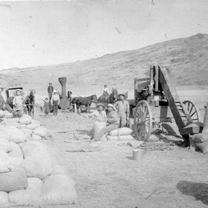 North of Sultana, in Tulare County, CA, wheat was threshed and bagged in the field ca 1888. Seated on bags of wheat at the center of this photo is wheat farmer John R. Reed, flanked by his son, Lyle, and his daughter. (Photo courtesy of Munn Reed)