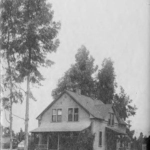 Photograph of house surrounded by tall trees. Cardboard is inscribed with ""The Ark."" If you know any details from this image please contact the Rancho Cucamonga Public Library at (909) 477-2720 or reference@cityofrc.us