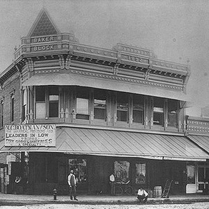 The Baker building of Porterville, CA, is shown as it appeared in 1894. It was built in 1892. It was rented out to M.K. Boatman and his son Charles. the sign Boatman and Son is shown. (Photo courtesy of Porterville Library)