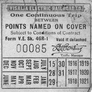 This was a ticket entitling the bearer to one continuous ride on the Visalia Electric Railroad Company between the points specified on the ticket. The ticket was issued sometime between 1916 and 1921. ((Photo courtesy of Frances Kirkman)