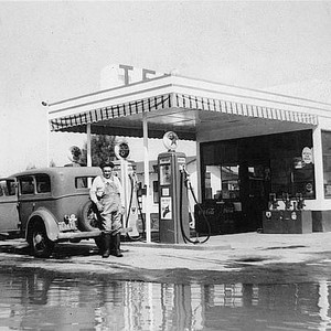 Bert Renshaw was the owner of a Texaco service station on Main Street in Pixley, CA. Renshaw is standing at the rear of a car being filled with gas. As of 2002, the location was the site of Pixley's boxing club.. (Photo courtesy of Carolyn M. Long)