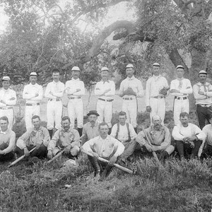 Members of the community baseball team in Lemon Cove, CA, in 1890 included Jude Glenn, Dee McKee, Earl Pogue, Bob Bequette, Ernest Britten, Sam Stingley, Porter Davis, Tom Pogue, and Byron Allen. (Photo courtesy of Frances Kirkman)