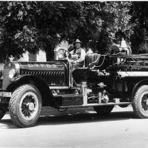 The was the new 1922 Stutz Bearcat fire truck acquired by the Dinuba, CA, volunteer fire department #2 when the firehouse was built in that year. Between 1922 and 1982, only three additional engines were purchased. The driver here was thought to be Frank Lyman (Photo courtesy of Joanne Andrews)