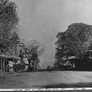 Taken between Oak and Mill streets, this view of Main Street in Porterville, CA, this photo. looking toward the north shows the Morton St. School in the distance. The school was remodeled in 1907 and then torn down in 1938. (Photo courtesy of Porterville Library)