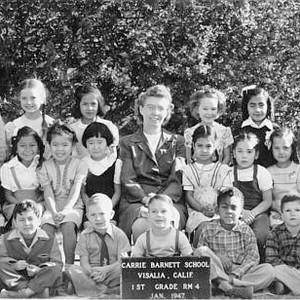 This 1947 1st grade (Rm 4) photo was taken at Carrie Barnett School in Visalia, CA. A few students have been identified: Severo Esquivel, bottom row far left; Seiko Kawasaki, middle row to left of teacher; Larry Todd, top row third from right; Nieva Esquivel (sister-in-law of the contributor), second from right of teacher; and Jerrlie Pyles, at right of sign. (Photo courtesy of Cecelia Esquivel)