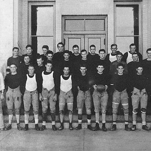 The town of Exeter, CA, had this community football team ca 1930. Businessmen were included along with students. Lloyd McWherter is second from left in the middle row. Ray Aubrey is at the end of the middle row, wearing a white shirt. (Photo courtesy of Lavene Douglas)