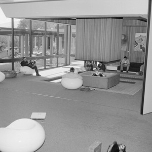West Valley College Campus Center Fireside Lounge with students, 1972