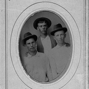 "These three men chose to have a portrait photograph taken in Porterville, CA, about 1880. They were, left to right, ""Stumpy"" Cochran (known for having only one arm), Jim McKinney, and an unidentified man. (Photo courtesy of Porterville Library)"