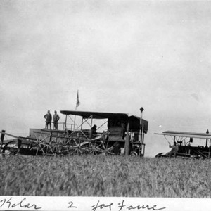 Multiple harvesters are shown in use in this field near Porterville, CA, ca 1920. Pictured on the Holt Harvester in the foreground are Matt Kolar and Joe Favre. (Photo courtesy of Mary Haven)