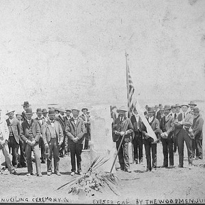 No identities are known of those participating in this June 9, 1901, marker unveiling by Woodmen of the World at the cemetery on Kaweah Avenue in Exeter, CA. (Photo courtesy of Delora Buckman)