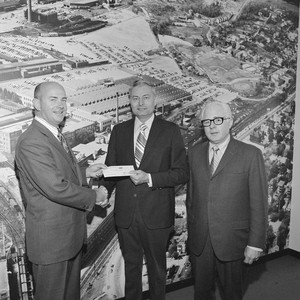 West Valley College Superintendent-President James P. Hardy receiving Foundation check from Gerald Sharp, foundation director and one unidentified man possibly associated with the Norton Company