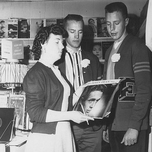 Two high school students consider a purchase of this 33 RPM James Dean album from clerk Alma Pendleton (Mrs. Gordon) Karnes at Ray Rivers' Music Store on 'E' Street in Exeter, CA. This photo reportedly was taken the day film star James Dean died in 1955. (Photo courtesy of Delora Buckman)
