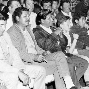 Cesar Chavez, founder of the United Farm Workers labor group, is at the center of this photo taken at the Maya Theater in Dinuba, CA, in 1968. (Photo courtesy of Dinuba Sentinel)