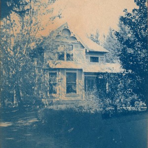 Blue-toned photograph of a victorian house. Possibly Dr. Reid's residence. If you know any details from this image please contact the Rancho Cucamonga Public Library at (909) 477-2720 or reference@cityofrc.us