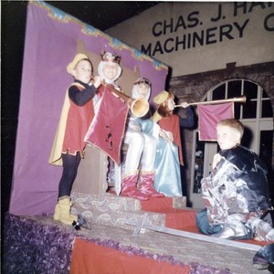 This Veterans of Foreign Wars float in the 1966 Christmas Parade in Visalia, CA, features David Harrell and Karen Strawser playing trumpets while Mike Strawser and Diane Harrell Byus are King Arthur and Queen Guinevere. Ernie Osborne plays the knight kneeling in front. Billie Harrell, owner of Billie's Costume Shop, made the costumes. (Photo courtesy of Diane Byus)