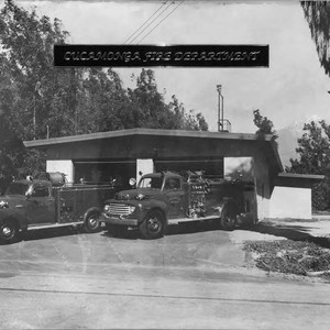 Black & white photograph of Cucamonga Fire Department with 1954 GMC Yankee and 1948 Ford General firetrucks. If you know any details from this image please contact the Rancho Cucamonga Public Library at (909) 477-2720 or reference@cityofrc.us