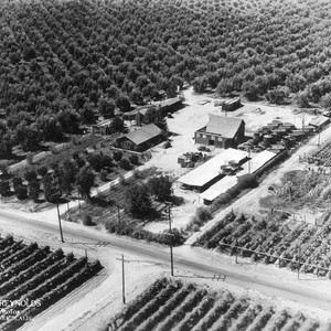 Olives were a primary crop for growers around Lindsay, CA, for decades. Here an olive growers orchards are shown around the ranch yard showing vats for curing olives. (Photo courtesy of Nancy Baird)