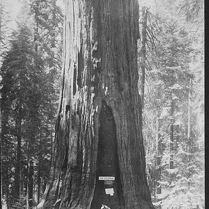 The General Sherman Tree, honoring Union General William Tecumseh Sherman of the Civil War, is shown during the 1920s. It is located by Highway 198 a few miles north of Giant Forest Village in Sequoia National Park, Tulare County, CA. (Photo courtesy of Alma Manlove)