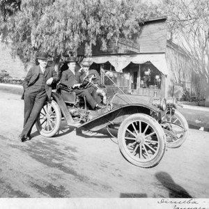 Jesse W. Bledsoe, operator of a second hand store in Dinuba, CA, was the proud owner and driver of this brass-era roadster, in January, 1913. (Photo courtesy of Joanne Andrews)