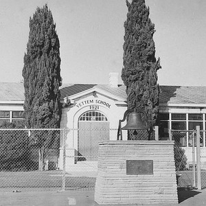 "On the Plaque "" this memorial is dedicated to the memory of the fore fathers. Community of Yettem 1902 Yettem Grammar School may 29,1900. This plaque, placed in front of Yettem School in Yettem, CA, in 1955, states it is dedicated to the memory of the forefathers of the community. The ""new"" school was built in 1921, and supplanted the original built in 1900. (Photo courtesy of Lucinne Bennett)"