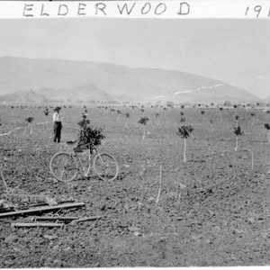 This 1911 photo shows a farmer inspecting his young orange trees in Elderwood, CA. (Photo courtesy of Linda Hengst)