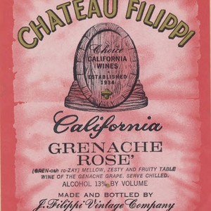 Red and gold label for Chateau Filippi California Grenache Rose. Label depicts illustration of a wine cask. Wine is made and bottled by J. Filippi Vintage Corp. in Mira Loma, California. If you know any details from this image please contact the Rancho Cucamonga Public Library at (909) 477-2720 or reference@cityofrc.us