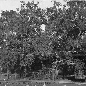 "This photo shows the entrance to Mooney Grove County Park in Visalia, CA, about 1920. This park is the site of the famous ""End of the Trail"" statue, and features a large grove of valley oak trees."
