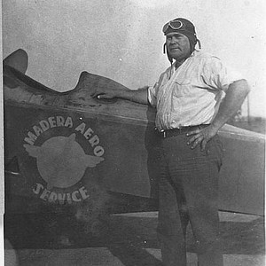 J. E. Beck stands in front of his airplane, representing Madera Aero Service. This was taken in 1931. (Photo courtesy of Nancy Baird)