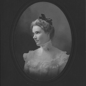 Photograph of young woman in white dress looking to the side. If you know any details from this image please contact the Rancho Cucamonga Public Library at (909) 477-2720 or reference@cityofrc.us