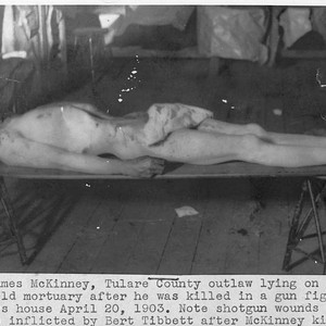 This photo shows the body of Tulare County, CA, outlaw James McKinney, lying on a slab in a Bakersfield, CA, mortuaruy after he was killed in a gunfight in a Chinese joss house April 20, 1903. Note the shotgun wounds in his face and neck. He was killed by Bert Tibbett.