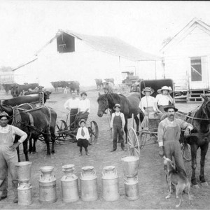 This is the dairy farm of Manuel D. Sousa when it was located near Hall Street and W. Goshen Avenue in Visalia, CA, in 1915. Sousa poses at the far right. Sousa's nephew, Jack Sousa, hold's the horse's reins at center, and niece Mary Sousa is in the right seat of the buggy. (Photo courtesy of Frank Alves)