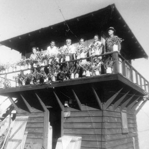 A couple known only as Mr. and Mrs. Brooks flank Brothers Fabian, Cassidy, Emmanuel and Ralph, Franciscan friars from St. Anthony's Retreat House east of Three Rivers, CA. The location is a fire lookout post in Sequoia National Forest in eastern Tulare County, CA. (Photo courtesy of St. Anthony's Retreat)