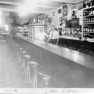 This is the interior of Brunswick Hall, a bar in Porterville, CA, as it appeared in 1938. Standing behind the counter are John M. Kotchevar, left, and Val Codona. (Photo courtesy of Mary Haven)