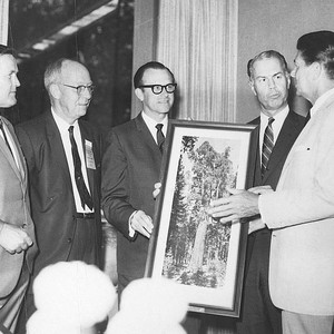 Shown during this formal presentation by California Governor Ronald Reagan (right) in the 1960s in Exeter, CA, are (left to right) State Assemblyman Bill Ketchum, unidentified man, State Senator Howard Way, and the Governor. (Photo courtesy of Delora Buckman)
