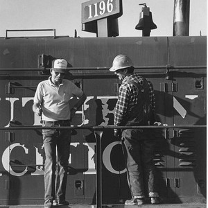 Staff of Visalia Electric Railroad Company stand by Engine #1196 of the company in this 1985 photo taken in Exeter, Calif. (Photo courtesy of Frances Kirkman)