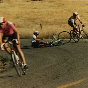 A rider falls as cyclists approach the Rocky Hill phase of the 1989 Dole Visalia Cycling Classic. Rocky Hill is just east of Exeter, CA. (Photo courtesy of Bobbi Hawkins)