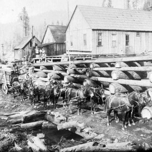 This team and wagon, operated by the John R. Reed family of Orosi, CA, hauled lumber for the Comstock Mill in the Sierra Nevada mountains of Central California. Other farming families did the same. (Photo courtesy of Munn Reed)