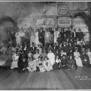 This was the cast of the Alta Club show at the Morton Opera House December 31, 1909, in Porterville, CA. The backdrop shows local merchants' advertisements.