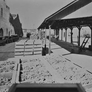 Photograph of grapes in boxes and cars aligned at the Virginia Dare Winery. If you know any details from this image please contact the Rancho Cucamonga Public Library at (909) 477-2720 or reference@cityofrc.us