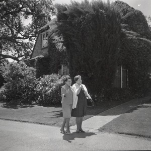 Two women outside the Giurlani House on the West Valley College Saratoga campus in April 1972